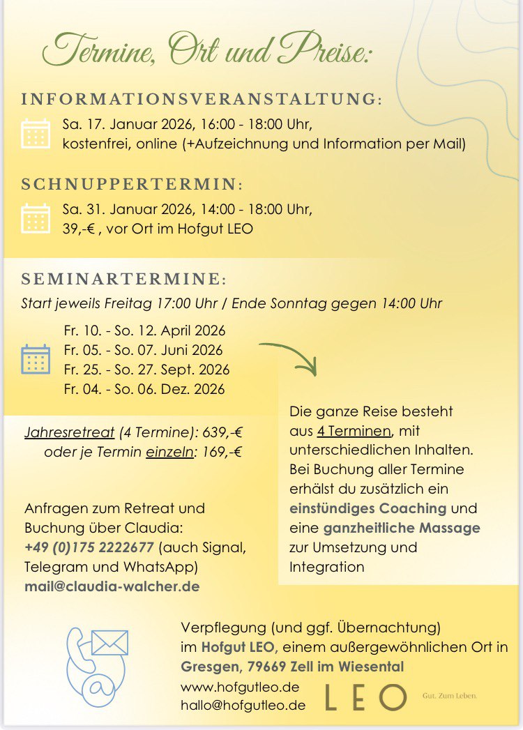 Dann ist diese Einladung für Dich. An vier Terminen (die auch einzeln buchbar sind), kannst Du in einer kleinen Gruppe, im wunderbaren Hofgut LEO, deine kraftvollen Schritte auf der Reise zu dir selbst gehen.