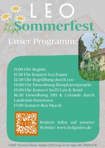 An diversen Info- und Verkaufsständen präsentieren sich befreundete Initiativen und Unternehmen: Zukunft.Raum.Schwarzwald, Biosphäre Schwarzwald, Glück im Glas – der Unverpacktladen Schopfheim, SoLaWi Möhrenblick, SoLaWi Dinkelberg, Wildstauden Berggarten, Hanselihof, Vincent Berger, das Team des Reziproken Raumes, Carl Beier, Pneumatit, Dreschflegel, Liesa Trefzer, Jessica Dörr, Wolfgang Kistner, Roman und Melanie Fuchs, Angelika Jentzen Actionpainting, Klaus Michael Romahn, Kreativworkshop Schopfheim, Claudia Walcher und Bernhard Rettler – und natürlich auch ein Info-Stand vom Hofgut LEO selbst!