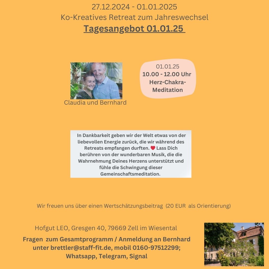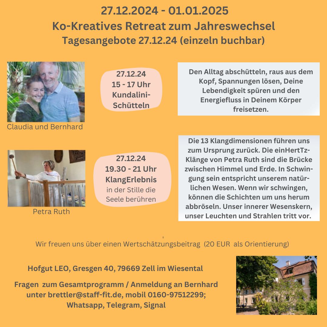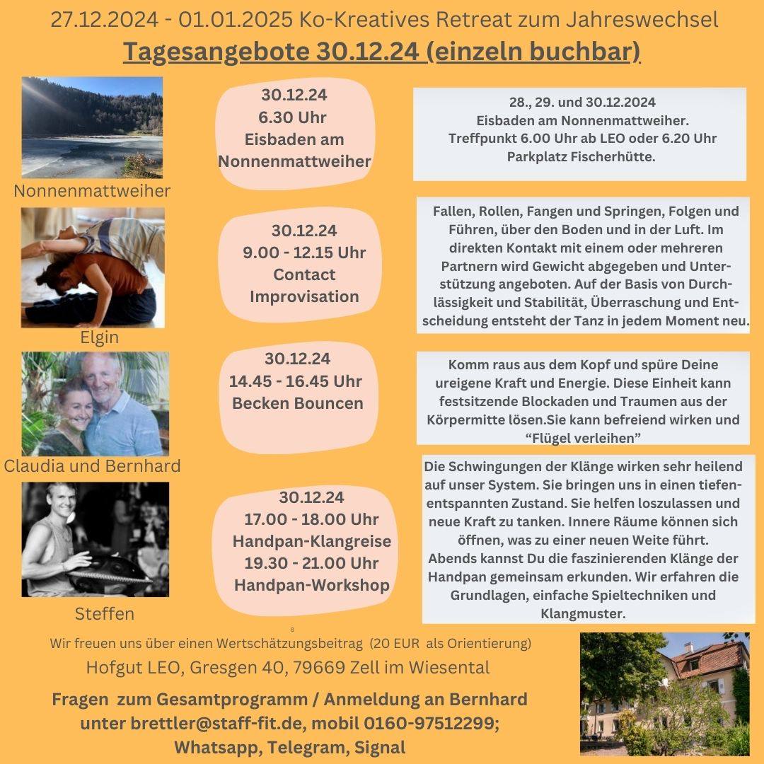 Tagesprogramm am 30. Dezember: ab 06:30 Uhr Eisbaden ab 09:00 Uhr Contact Improvisation ab 14:45 Uhr Becken Bouncen ab 17 Uhr Handpan-Klangreise Ab 19.30 Uhr Handpan-Workshop Alles ist auch einzeln buchbar. Anmeldung bei Bernhard: 0049 (0) 160 - 97 51 22 99 (auch Signal, Telegram oder WhatsApp). Oder brettler@staff-fit.de